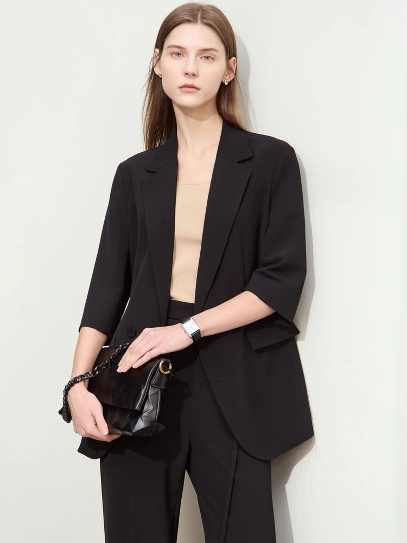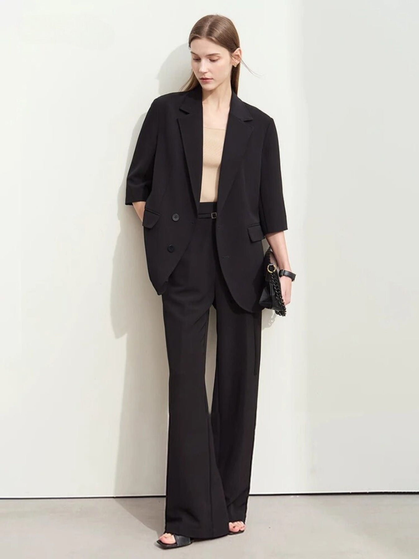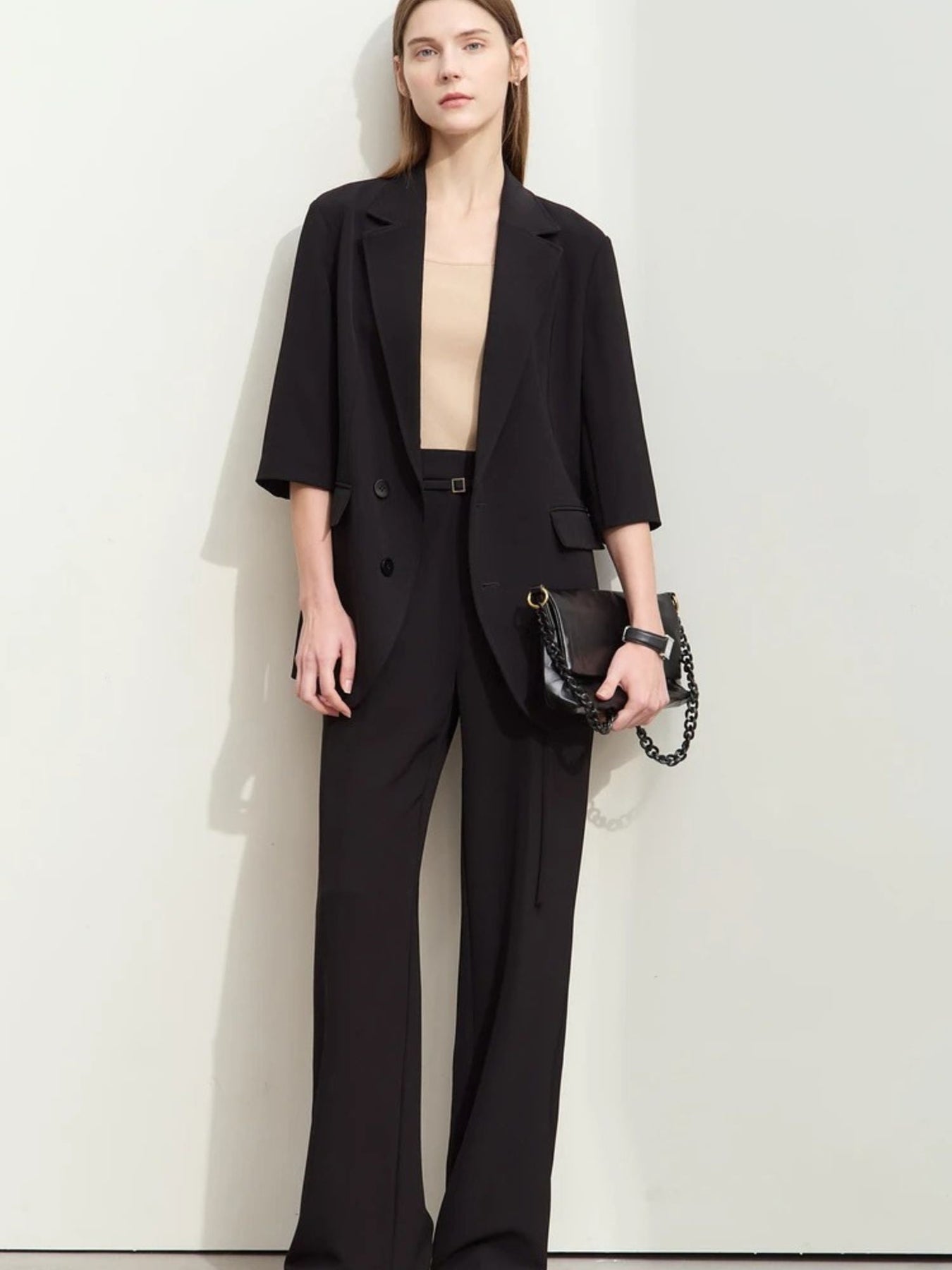This black blazer set with high-waisted, wide-legged trousers is a versatile addition to any wardrobe. The loose-fitting blazer features a lapel collar, a double-breasted front, and practical pockets. Paired with the high-waisted, wide-legged trousers, it creates a sleek silhouette that flatters every figure. The set can be worn alone or paired with other favorite pieces from your wardrobe.