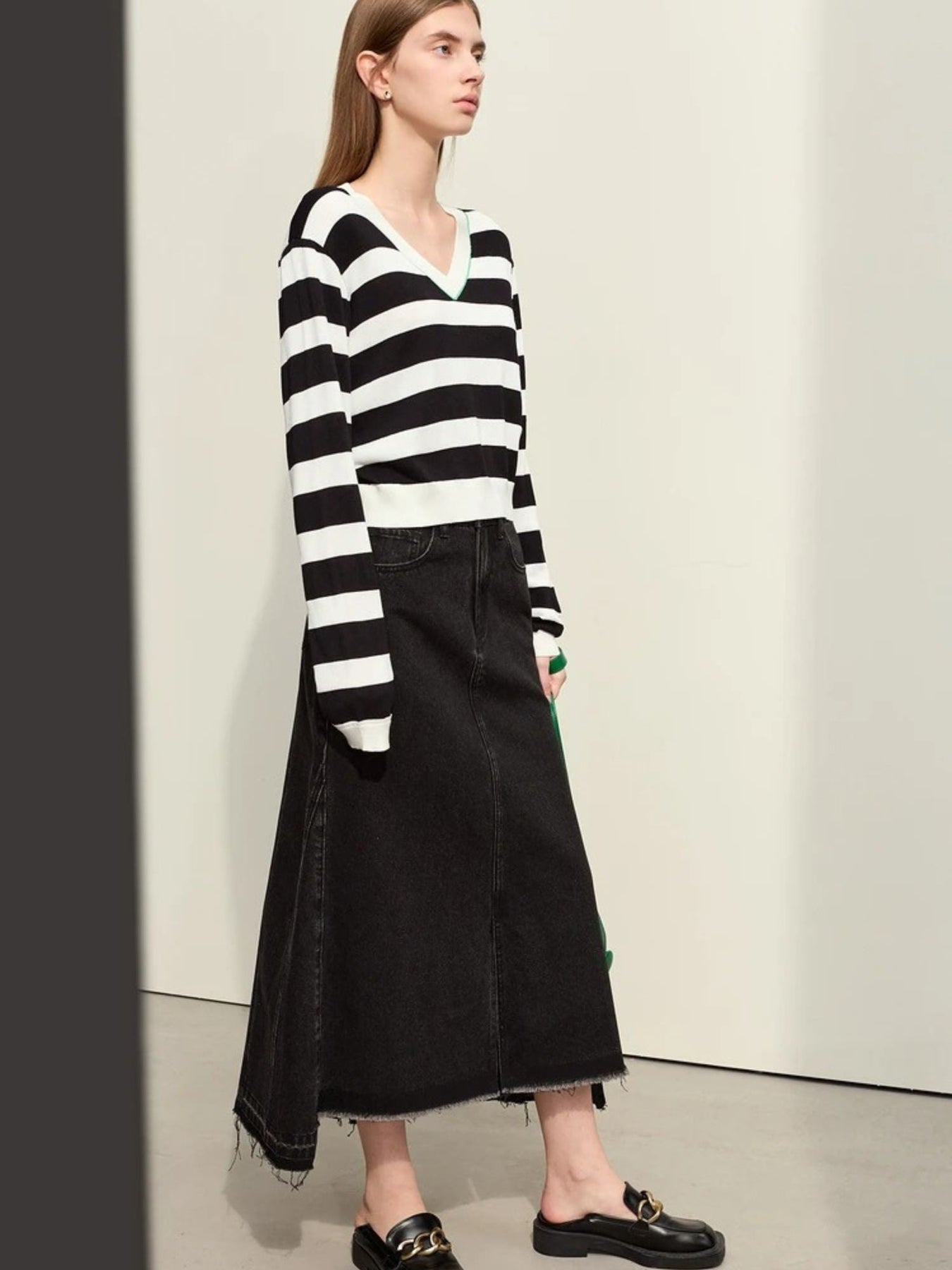 Midi-length denim skirt with an A-line silhouette, available in black and denim blue. This skirt features a subtle front slit and an open, frayed hem for a modern and versatile look. Crafted from high-quality cotton, it offers a comfortable fit.
